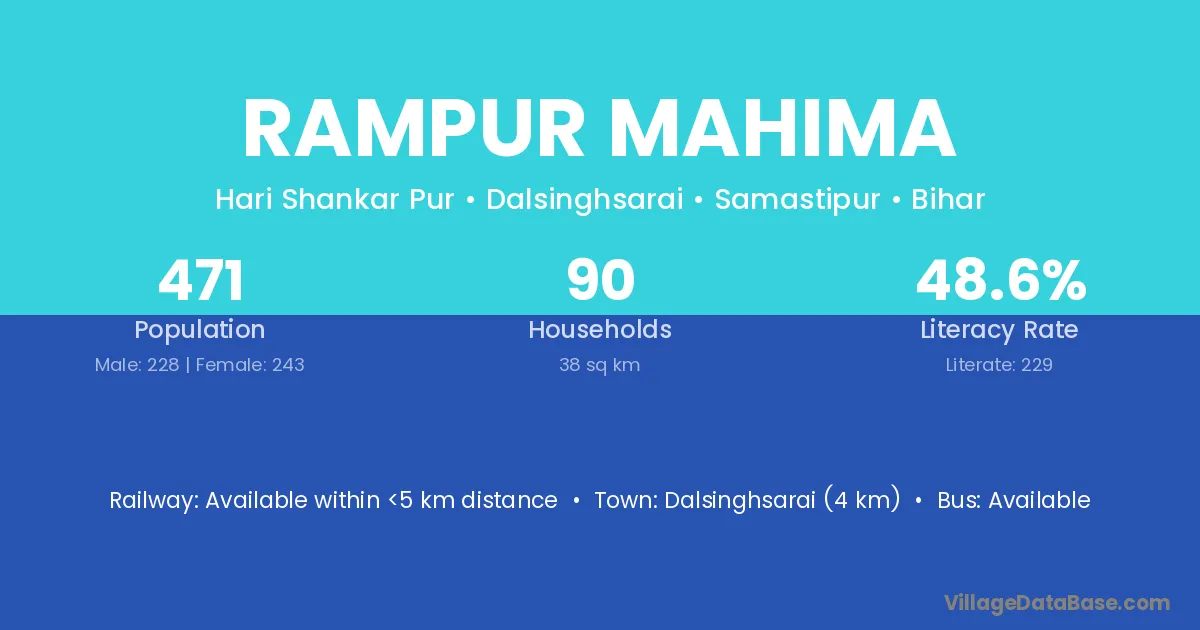 Dalsinghsarai (4 km) is the nearest town to Rampur Mahima village for major economic activities and is located approximately 4 km away.