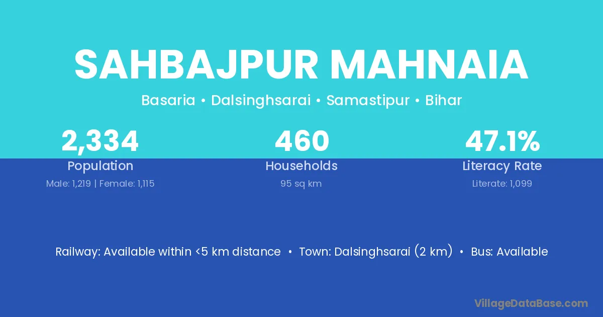 Dalsinghsarai (2 km) is the nearest town to Sahbajpur Mahnaia village for major economic activities and is located approximately 2 km away.