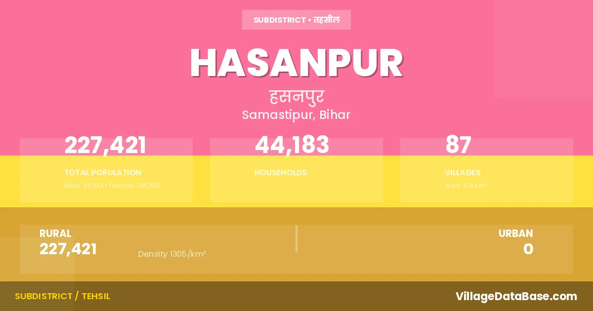 Hasanpur is a town and Subdivision in the Samastipur district of the Bihar. In India, a Subdivision is a subdivision of a district responsible for the administration and revenue collection of a specific area within the district. Subdivisions play a crucial role in the local governance structure, contributing significantly to the development and administration of their communities.