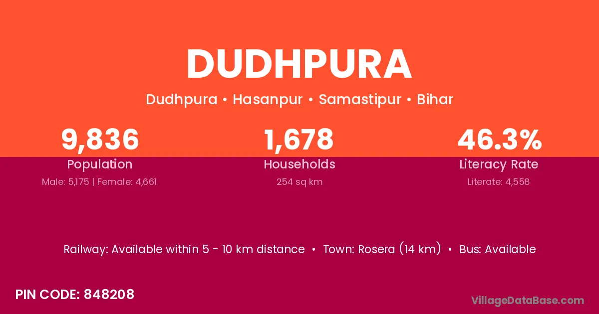 Rosera (14 km) is the nearest town to Dudhpura village for major economic activities and is located approximately 14 km away.