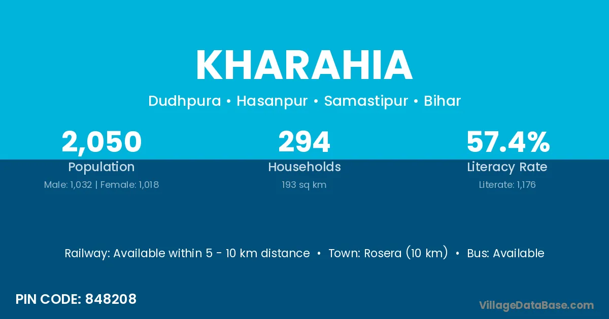 Rosera (10 km) is the nearest town to Kharahia village for major economic activities and is located approximately 10 km away.