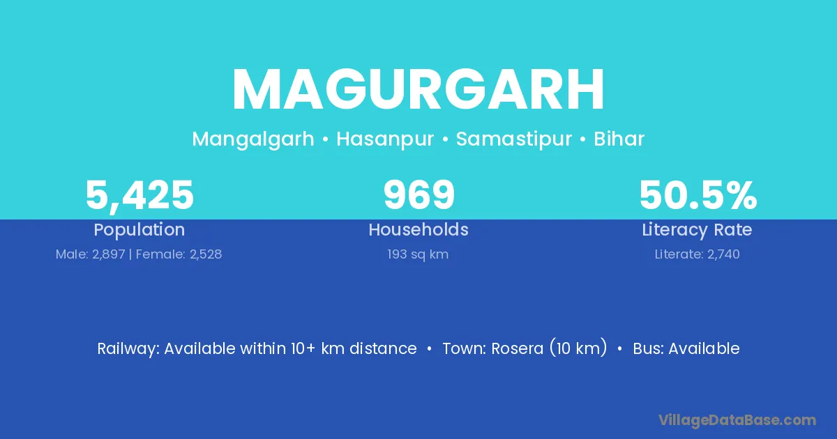 Rosera (10 km) is the nearest town to Magurgarh village for major economic activities and is located approximately 10 km away.