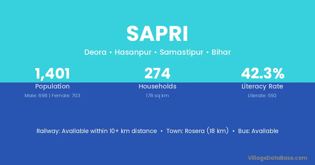 Sapri village has a total population of 1,401 people, of which 698 are males and 703 are females.