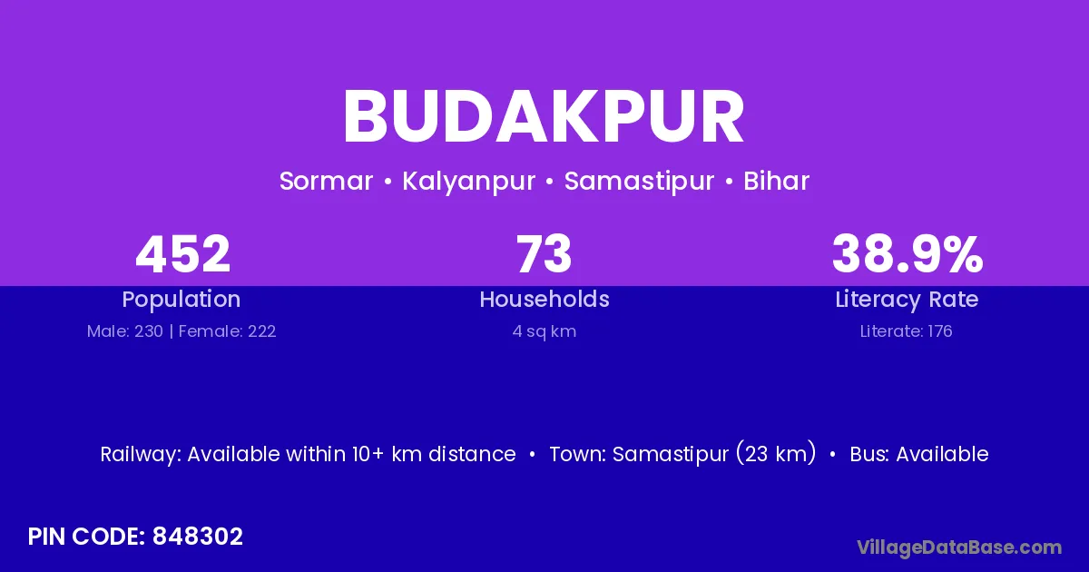 Samastipur (23 km) is the nearest town to Budakpur village for major economic activities and is located approximately 23 km away.
