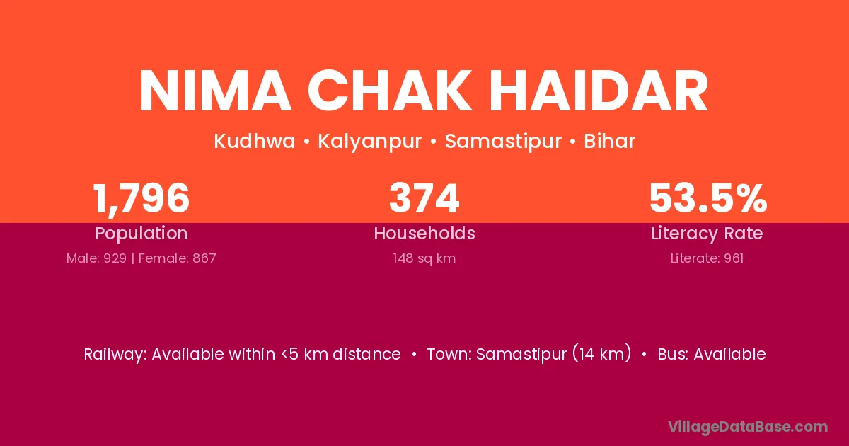 Samastipur (14 km) is the nearest town to Nima Chak Haidar village for major economic activities and is located approximately 14 km away.