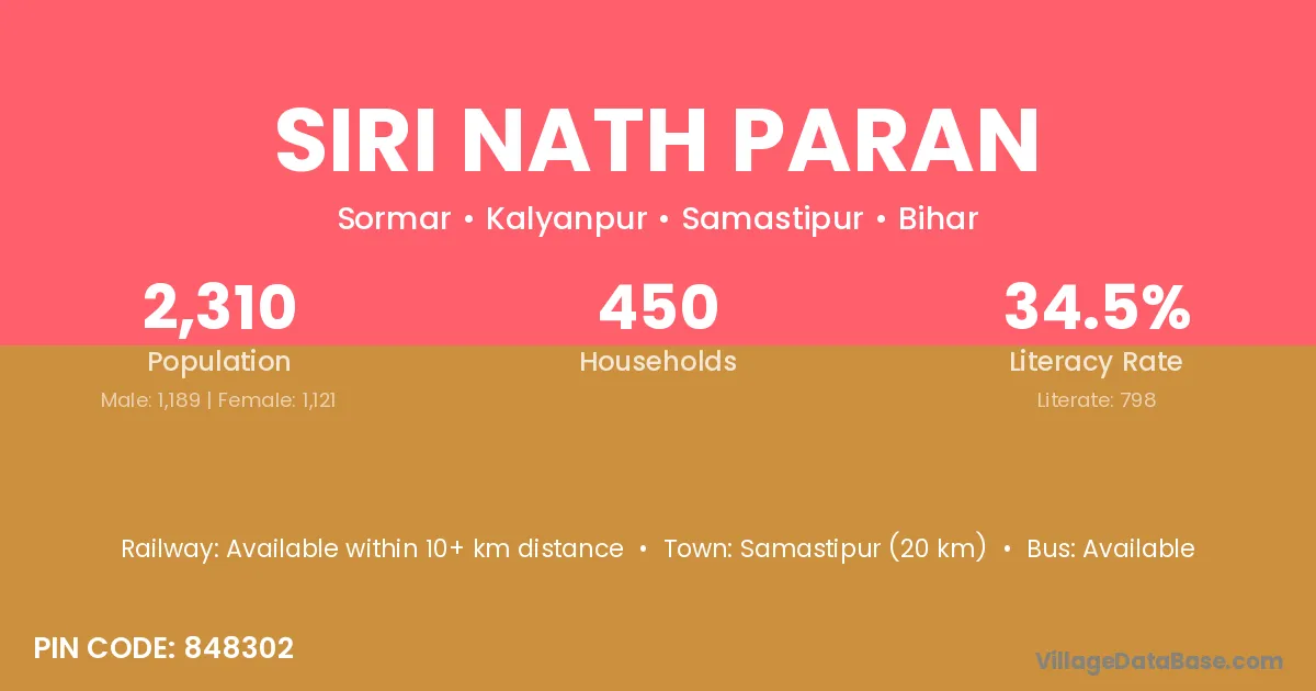 Samastipur (20 km) is the nearest town to Siri Nath Paran village for major economic activities and is located approximately 20 km away.