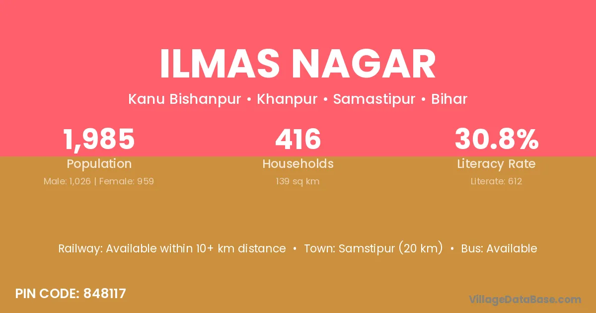 Samstipur (20 km) is the nearest town to Ilmas Nagar village for major economic activities and is located approximately 20 km away.