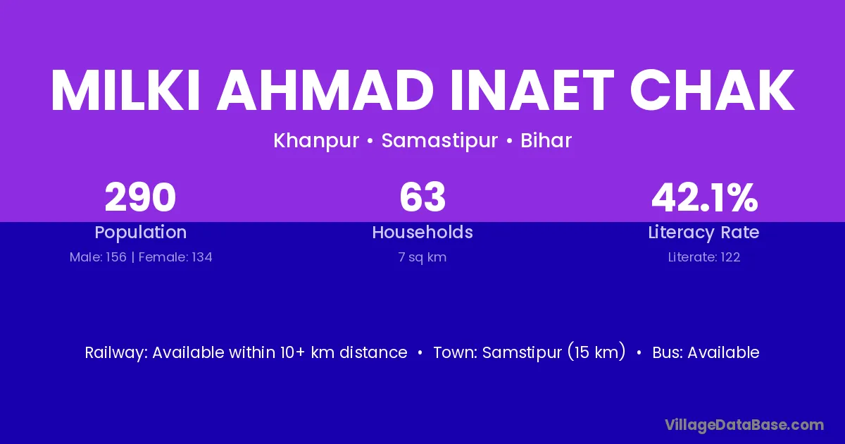 Samstipur (15 km) is the nearest town to Milki Ahmad Inaet Chak village for major economic activities and is located approximately 15 km away.