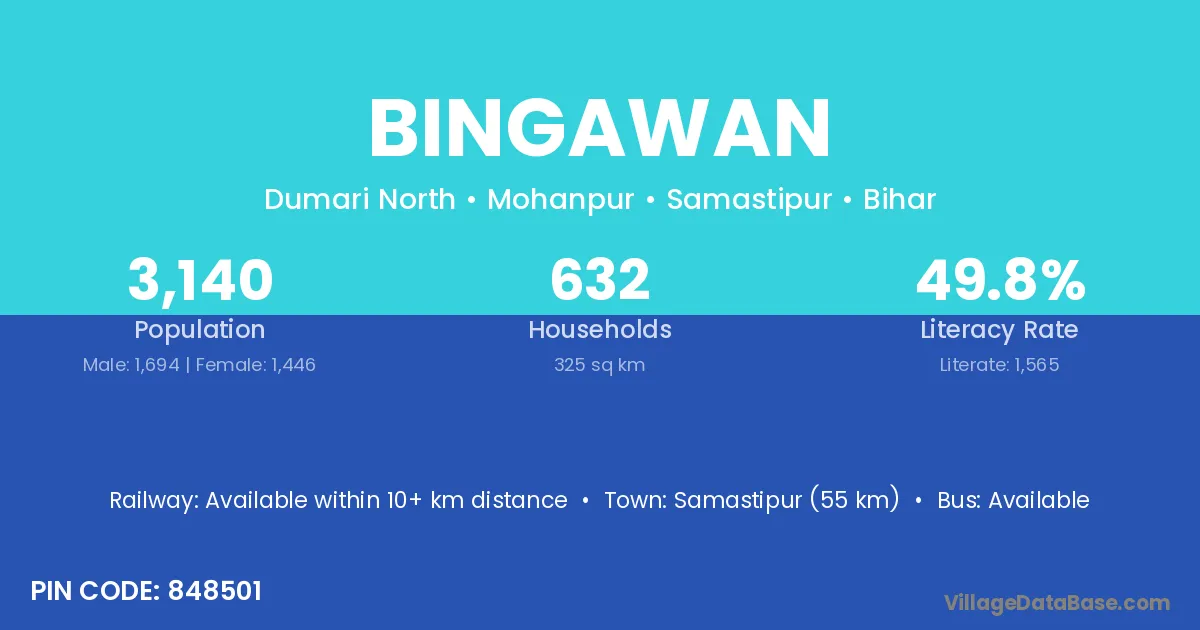 Samastipur (55 km) is the nearest town to Bingawan village for major economic activities and is located approximately 55 km away.