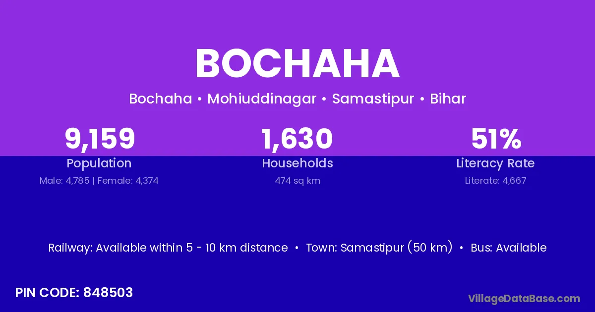 Samastipur (50 km) is the nearest town to Bochaha village for major economic activities and is located approximately 50 km away.