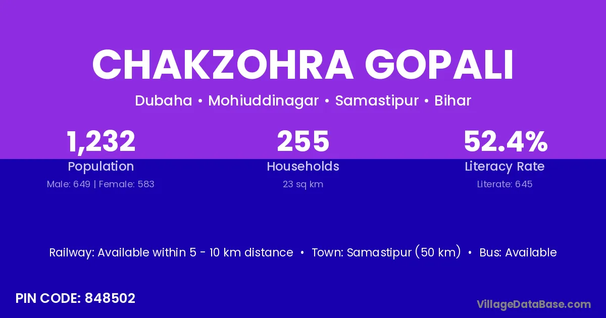 Samastipur (50 km) is the nearest town to Chakzohra Gopali village for major economic activities and is located approximately 50 km away.