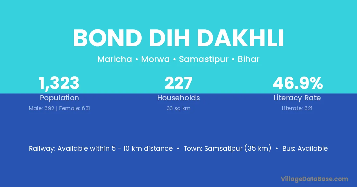 Samsatipur (35 km) is the nearest town to Bond Dih Dakhli village for major economic activities and is located approximately 35 km away.