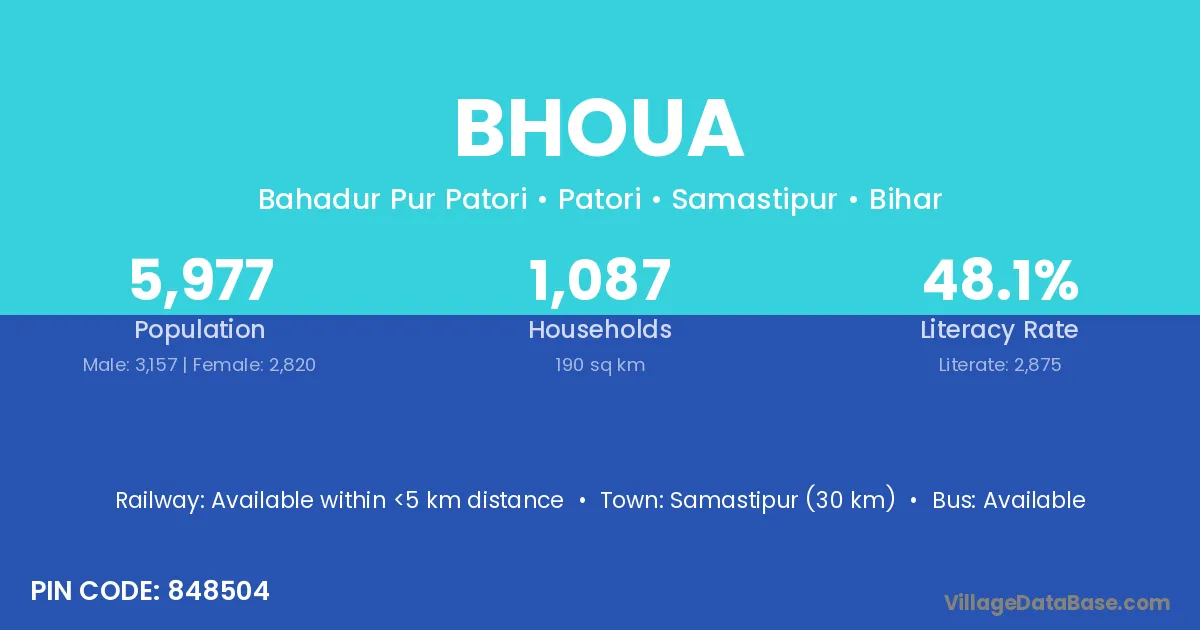 Samastipur (30 km) is the nearest town to Bhoua village for major economic activities and is located approximately 30 km away.