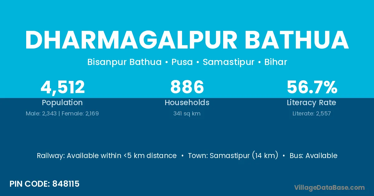 Samastipur (14 km) is the nearest town to Dharmagalpur Bathua village for major economic activities and is located approximately 14 km away.