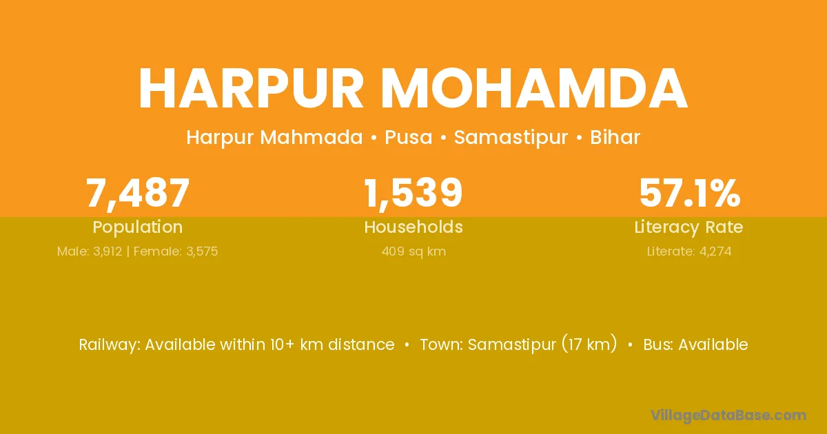 Samastipur (17 km) is the nearest town to Harpur Mohamda village for major economic activities and is located approximately 17 km away.