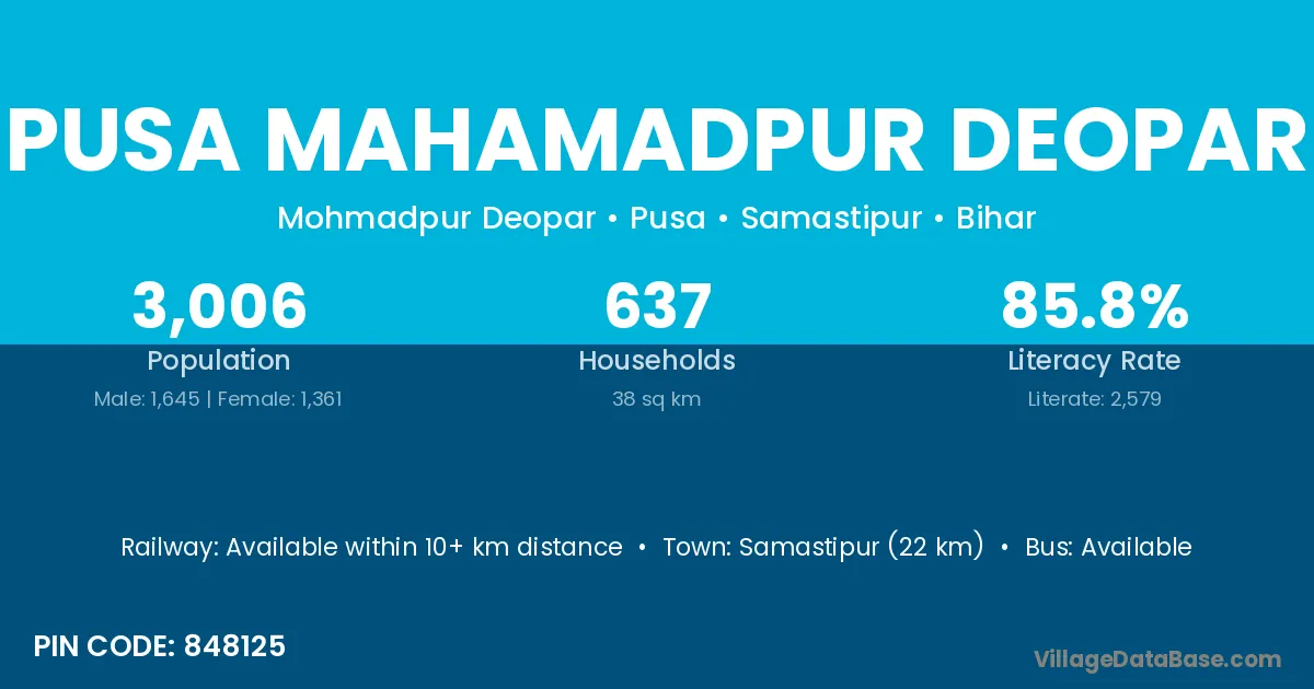 Samastipur (22 km) is the nearest town to Pusa Mahamadpur Deopar village for major economic activities and is located approximately 22 km away.
