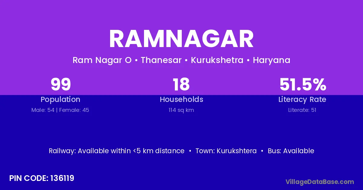 The literacy rate of Ramnagar village is 53.85%. Male literacy stands at 50.00% and female literacy at 58.33%.