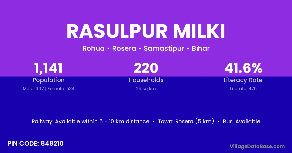 Rosera (5 km) is the nearest town to Rasulpur Milki village for major economic activities and is located approximately 5 km away.