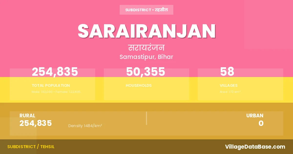 Sarairanjan is a town and Subdivision in the Samastipur district of the Bihar. In India, a Subdivision is a subdivision of a district responsible for the administration and revenue collection of a specific area within the district. Subdivisions play a crucial role in the local governance structure, contributing significantly to the development and administration of their communities.