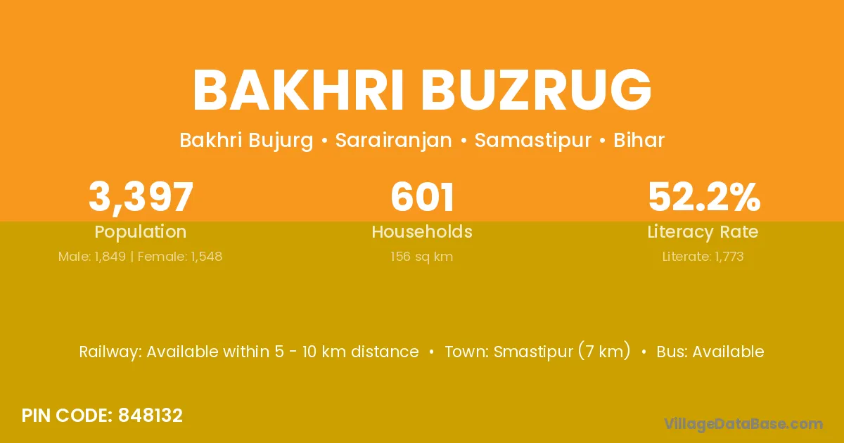 Bakhri Buzrug village has a total population of 3,397 people, of which 1,849 are males and 1,548 are females.