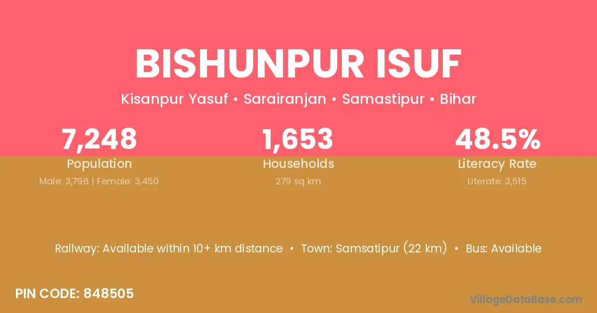 Bishunpur Isuf village has a total population of 7,248 people, of which 3,798 are males and 3,450 are females.