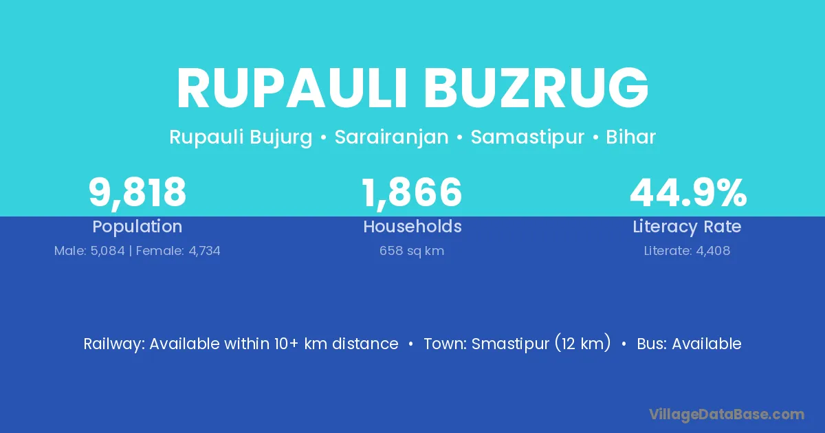 Smastipur (12 km) is the nearest town to Rupauli Buzrug village for major economic activities and is located approximately 12 km away.
