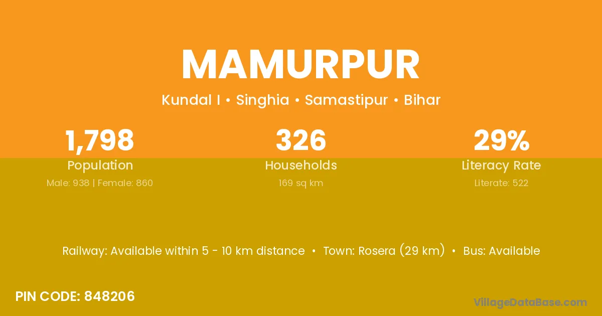 Rosera (29 km) is the nearest town to Mamurpur village for major economic activities and is located approximately 29 km away.