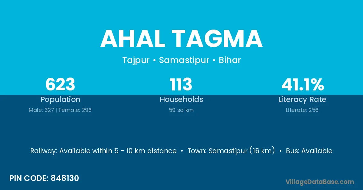 Samastipur (16 km) is the nearest town to Ahal Tagma village for major economic activities and is located approximately 16 km away.