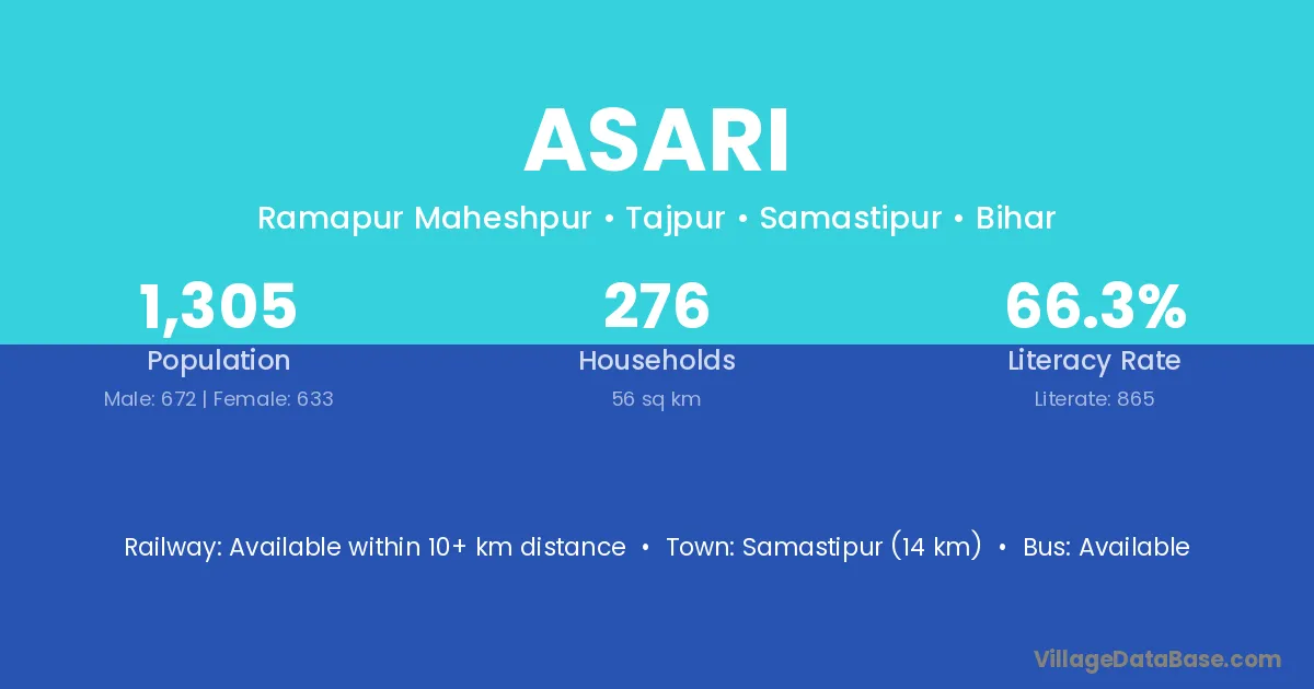 Samastipur (14 km) is the nearest town to Asari village for major economic activities and is located approximately 14 km away.