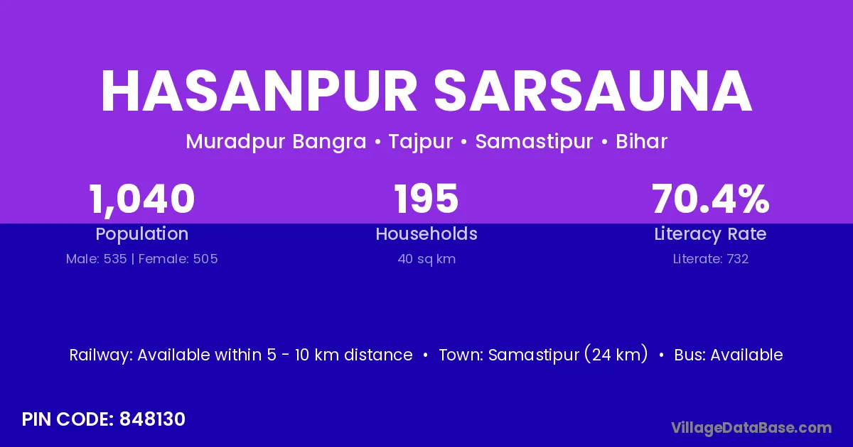 Samastipur (24 km) is the nearest town to Hasanpur Sarsauna village for major economic activities and is located approximately 24 km away.