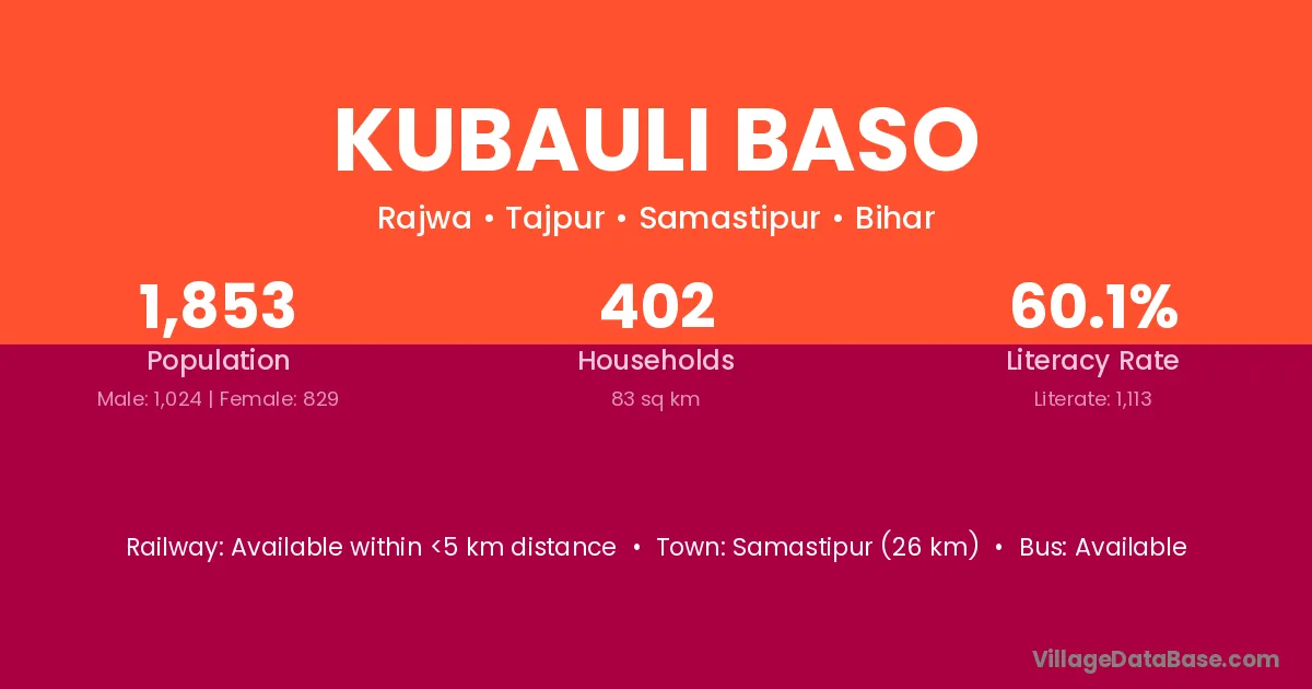 Samastipur (26 km) is the nearest town to Kubauli Baso village for major economic activities and is located approximately 26 km away.