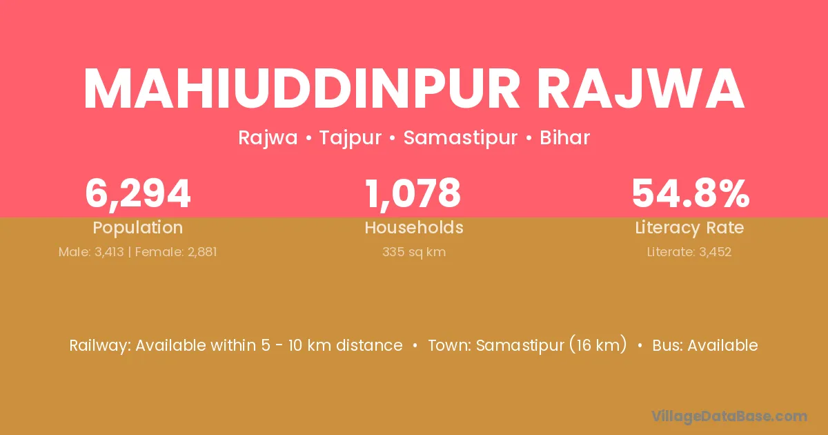 Samastipur (16 km) is the nearest town to Mahiuddinpur Rajwa village for major economic activities and is located approximately 16 km away.