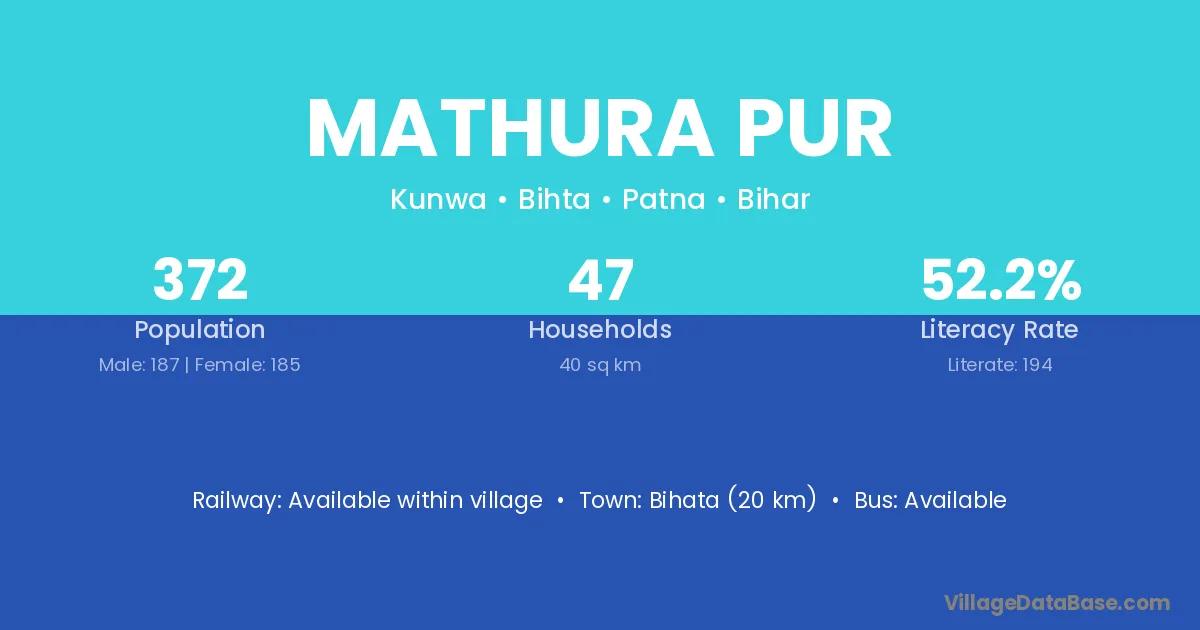 Samastipur (30 km) is the nearest town to Mathura Pur village for major economic activities and is located approximately 30 km away.