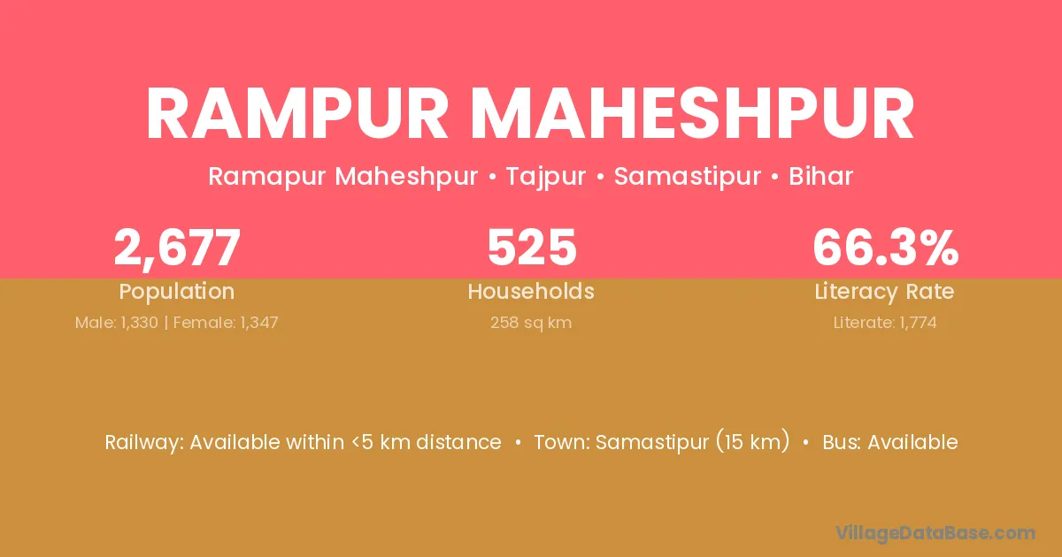 Samastipur (15 km) is the nearest town to Rampur Maheshpur village for major economic activities and is located approximately 15 km away.