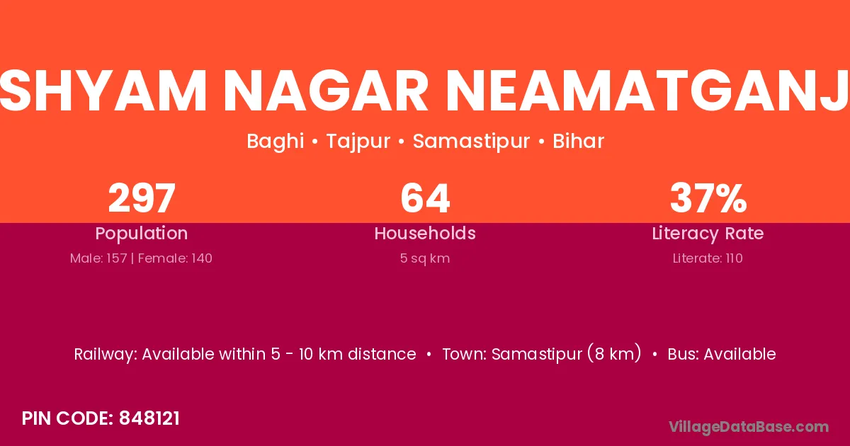 Samastipur (8 km) is the nearest town to Shyam Nagar Neamatganj village for major economic activities and is located approximately 8 km away.