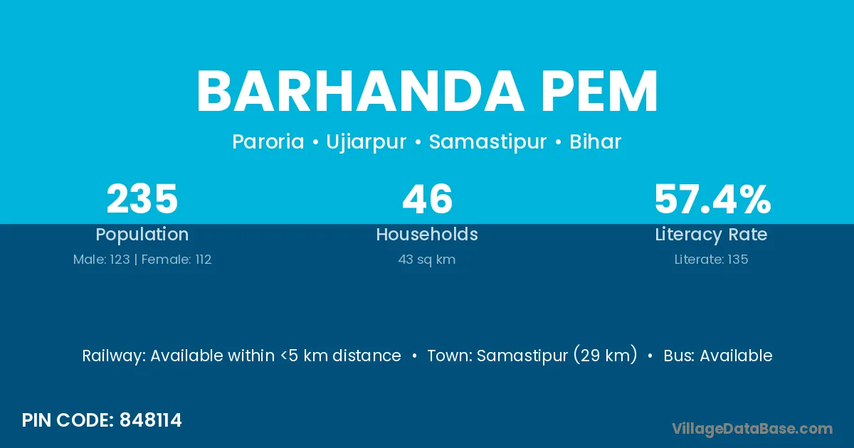 Samastipur (29 km) is the nearest town to Barhanda Pem village for major economic activities and is located approximately 29 km away.