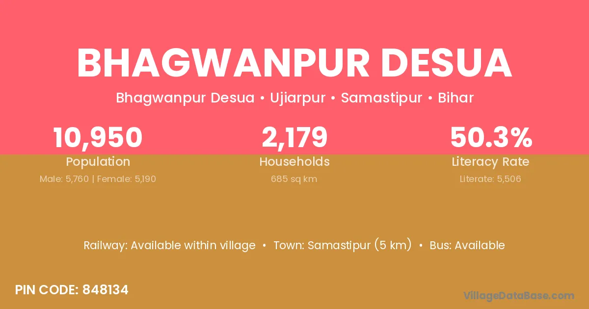 Samastipur (5 km) is the nearest town to Bhagwanpur Desua village for major economic activities and is located approximately 5 km away.