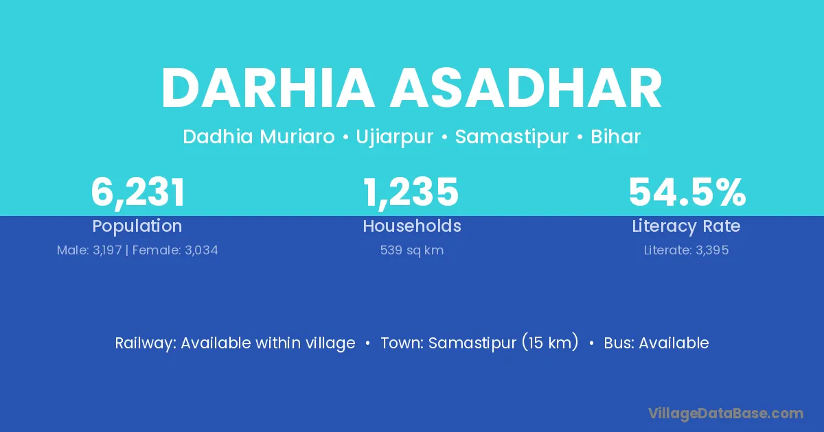 Samastipur (15 km) is the nearest town to Darhia Asadhar village for major economic activities and is located approximately 15 km away.