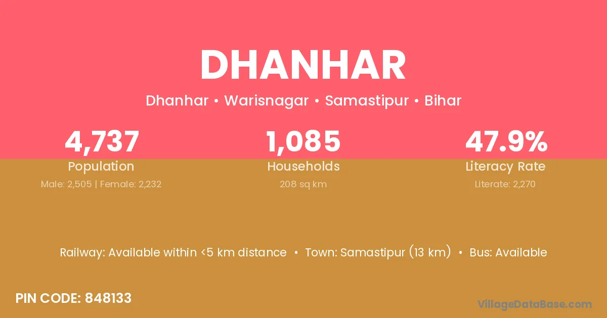 Samastipur (13 km) is the nearest town to Dhanhar village for major economic activities and is located approximately 13 km away.