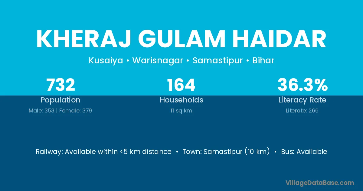 Samastipur (10 km) is the nearest town to Kheraj Gulam Haidar village for major economic activities and is located approximately 10 km away.