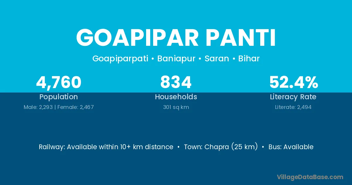 Chapra (25 km) is the nearest town to Goapipar Panti village for major economic activities and is located approximately 25 km away.