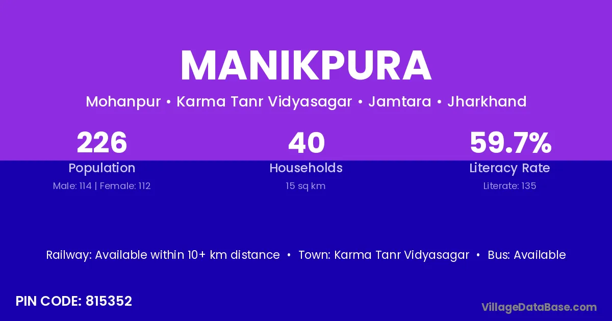 The literacy rate of Manikpura village is 60.74%. Male literacy stands at 69.52% and female literacy at 51.69%.