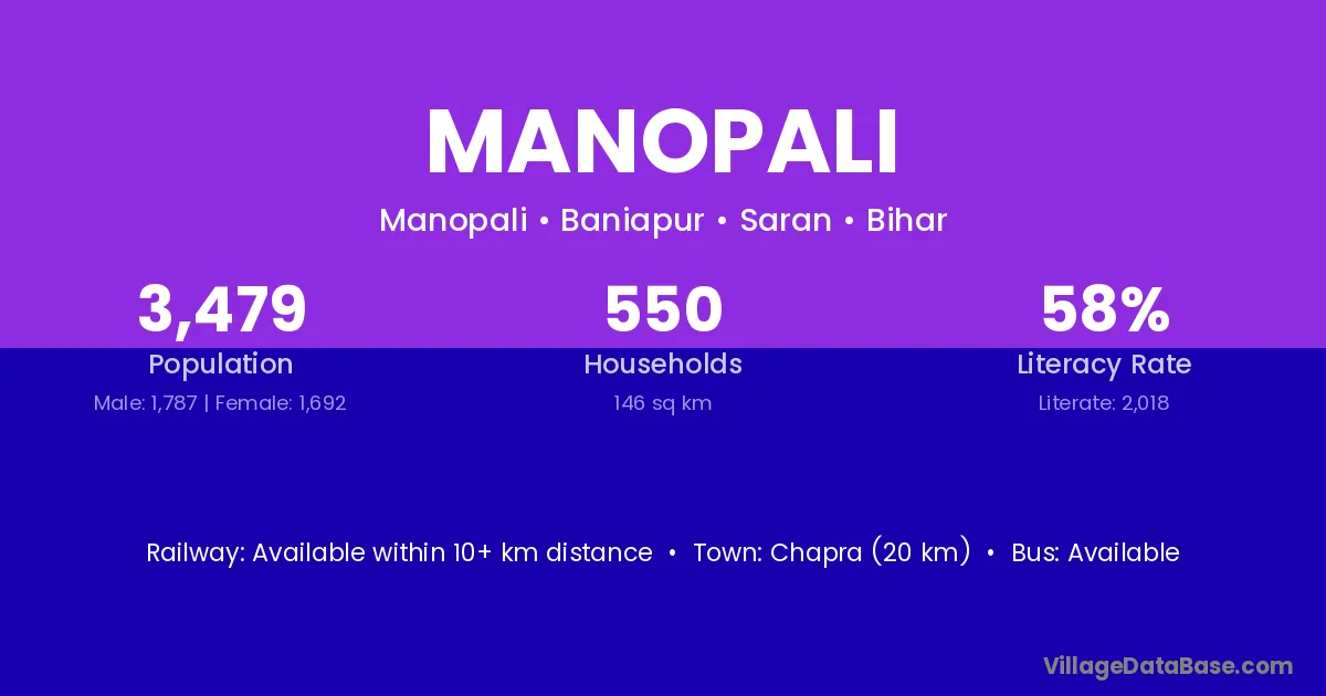 Chapra (20 km) is the nearest town to Manopali village for major economic activities and is located approximately 20 km away.