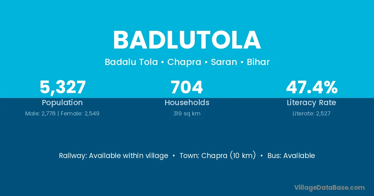 Chapra (10 km) is the nearest town to Badlutola village for major economic activities and is located approximately 10 km away.