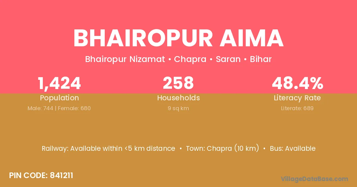 Chapra (10 km) is the nearest town to Bhairopur Aima village for major economic activities and is located approximately 10 km away.