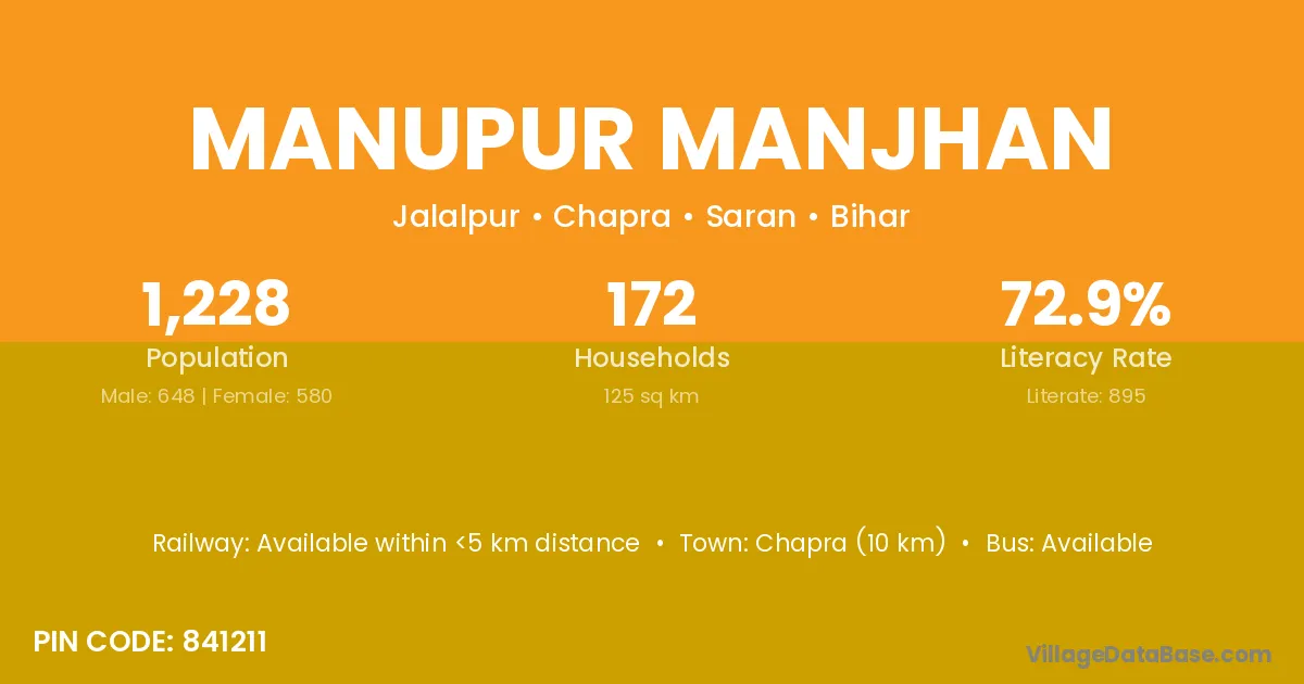 Chapra (10 km) is the nearest town to Manupur Manjhan village for major economic activities and is located approximately 10 km away.