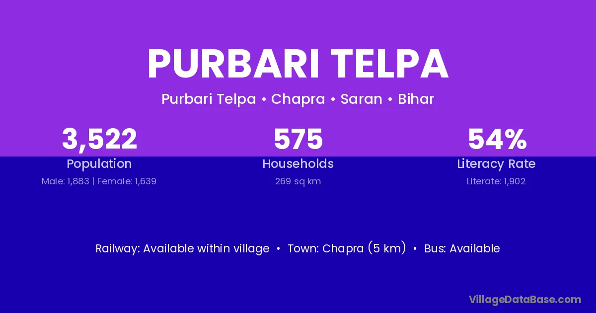 Chapra (5 km) is the nearest town to Purbari Telpa village for major economic activities and is located approximately 5 km away.