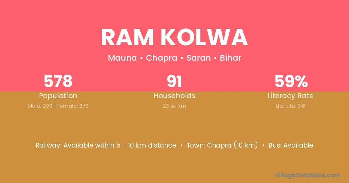Chapra (10 km) is the nearest town to Ram Kolwa village for major economic activities and is located approximately 10 km away.