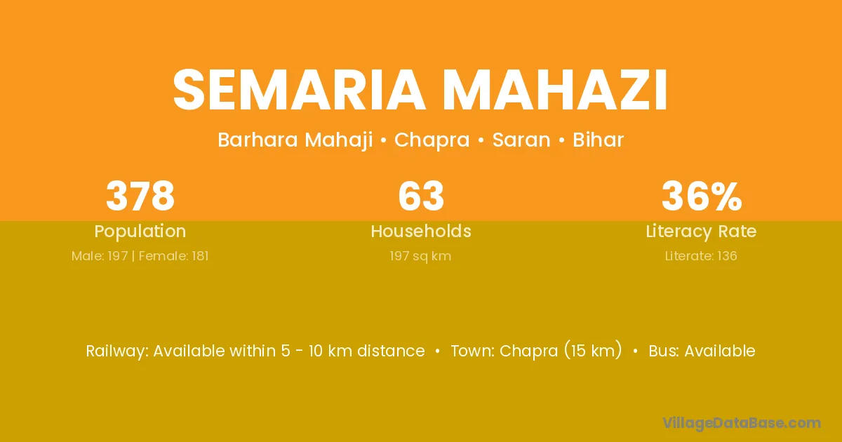 Chapra (15 km) is the nearest town to Semaria Mahazi village for major economic activities and is located approximately 15 km away.