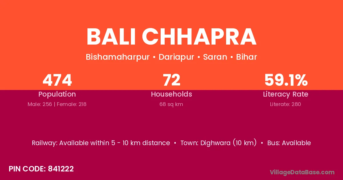 Bali Chhapra village has a total population of 474 people, of which 256 are males and 218 are females.